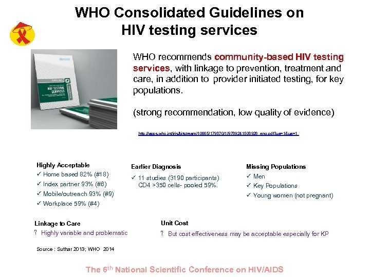 WHO Consolidated Guidelines on HIV testing services WHO recommends community-based HIV testing services, with linkage to prevention, treatment and care, in addition to provider initiated testing, for key populations. (strong recommendation, low quality of evidence) http: //apps. who. int/iris/bitstream/10665/179870/1/9789241508926_eng. pdf? ua=1&ua=1 Highly Acceptable ü Home based 82% (#18) ü Index partner 93% (#6) ü Mobile/outreach 93% (#9) ü Workplace 59% (#4) Earlier Diagnosis Missing Populations ü 11 studies (3190 participants) CD 4 >350 cells- pooled 59%. ü Men ü Key Populations ü Young women (not pregnant) Linkage to Care Unit Cost ? Highly variable and problematic ? But cost effectiveness may be acceptable especially for KP Source : Suthar 2013; WHO 2014 The 6 th National Scientific Conference on HIV/AIDS