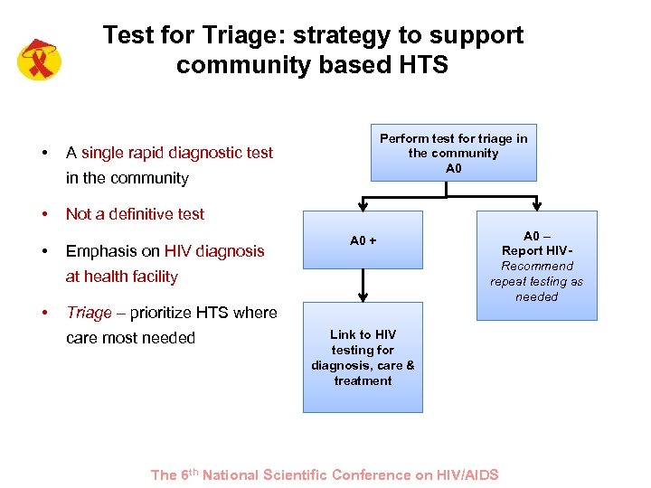 Test for Triage: strategy to support community based HTS • Perform test for triage in the community A 0 A single rapid diagnostic test in the community • • Not a definitive test Emphasis on HIV diagnosis A 0 + at health facility • Triage – prioritize HTS where care most needed A 0 – Report HIVRecommend repeat testing as needed Link to HIV testing for diagnosis, care & treatment The 6 th National Scientific Conference on HIV/AIDS