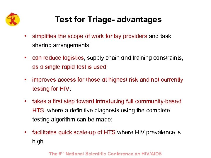 Test for Triage- advantages • simplifies the scope of work for lay providers and task sharing arrangements; • can reduce logistics, supply chain and training constraints, as a single rapid test is used; • improves access for those at highest risk and not currently testing for HIV; • takes a first step toward introducing full community-based HTS, where a definitive diagnosis using the complete testing algorithm can be made; • facilitates quick scale-up of HTS where HIV prevalence is high The 6 th National Scientific Conference on HIV/AIDS
