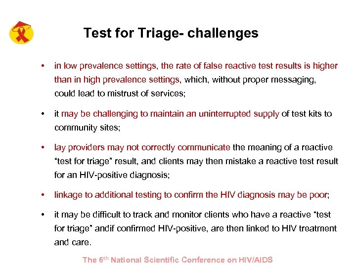 Test for Triage- challenges • in low prevalence settings, the rate of false reactive test results is higher than in high prevalence settings, which, without proper messaging, could lead to mistrust of services; • it may be challenging to maintain an uninterrupted supply of test kits to community sites; • lay providers may not correctly communicate the meaning of a reactive “test for triage” result, and clients may then mistake a reactive test result for an HIV-positive diagnosis; • linkage to additional testing to confirm the HIV diagnosis may be poor; • it may be difficult to track and monitor clients who have a reactive “test for triage” andif confirmed HIV-positive, are then linked to HIV treatment and care. The 6 th National Scientific Conference on HIV/AIDS