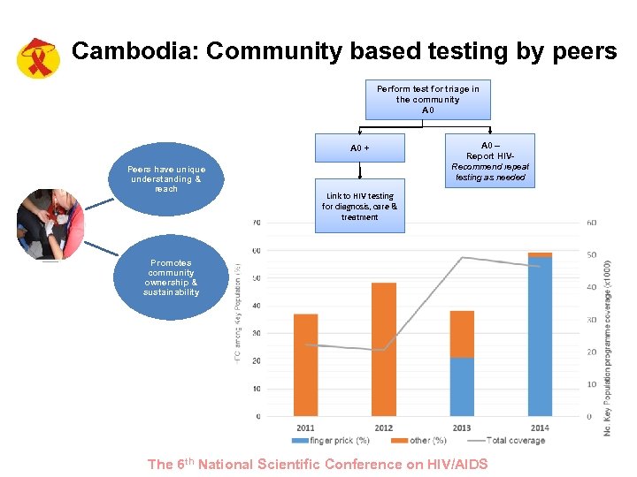 Cambodia: Community based testing by peers Perform test for triage in the community A 0 + Peers have unique understanding & reach A 0 – Report HIVRecommend repeat testing as needed Link to HIV testing for diagnosis, care & treatment Promotes community ownership & sustainability The 6 th National Scientific Conference on HIV/AIDS