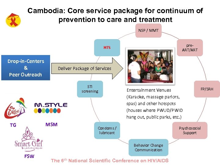 Cambodia: Core service package for continuum of prevention to care and treatment NSP / MMT pre. ART/ART HTS Drop-in-Centers & Peer Outreach Deliver Package of Services STI screening MSM TG Entertainment Venues (Karaoke, massage parlors, spas) and other hotspots (houses where PWUD/PWID hang out, public parks, etc. ) Condoms / lubricant Psychosocial Support Behavior Change Communication FSW FP/SRH The 6 th National Scientific Conference on HIV/AIDS