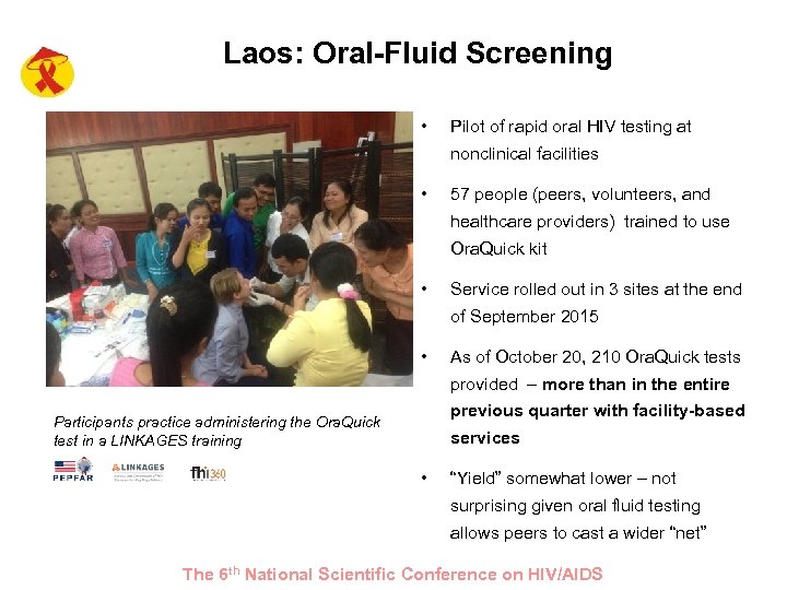 Laos: Oral-Fluid Screening • Pilot of rapid oral HIV testing at nonclinical facilities • 57 people (peers, volunteers, and healthcare providers) trained to use Ora. Quick kit • Service rolled out in 3 sites at the end of September 2015 • As of October 20, 210 Ora. Quick tests provided – more than in the entire previous quarter with facility-based Participants practice administering the Ora. Quick test in a LINKAGES training services • “Yield” somewhat lower – not surprising given oral fluid testing allows peers to cast a wider “net” The 6 th National Scientific Conference on HIV/AIDS