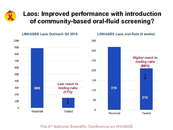 Laos: Improved performance with introduction of community-based oral-fluid screening? Higher reach to testing ratio (66%) 886 Low reach to testing ratio (17%) 319 210 Tested The 6 th National Scientific Conference on HIV/AIDS