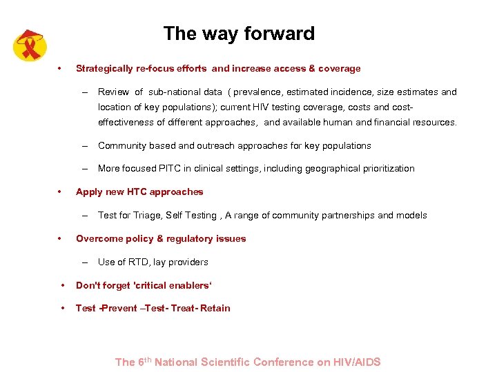 The way forward • Strategically re-focus efforts and increase access & coverage – Review of sub-national data ( prevalence, estimated incidence, size estimates and location of key populations); current HIV testing coverage, costs and costeffectiveness of different approaches, and available human and financial resources. – Community based and outreach approaches for key populations – More focused PITC in clinical settings, including geographical prioritization • Apply new HTC approaches – Test for Triage, Self Testing , A range of community partnerships and models • Overcome policy & regulatory issues – Use of RTD, lay providers • Don't forget 'critical enablers‘ • Test -Prevent –Test- Treat- Retain The 6 th National Scientific Conference on HIV/AIDS