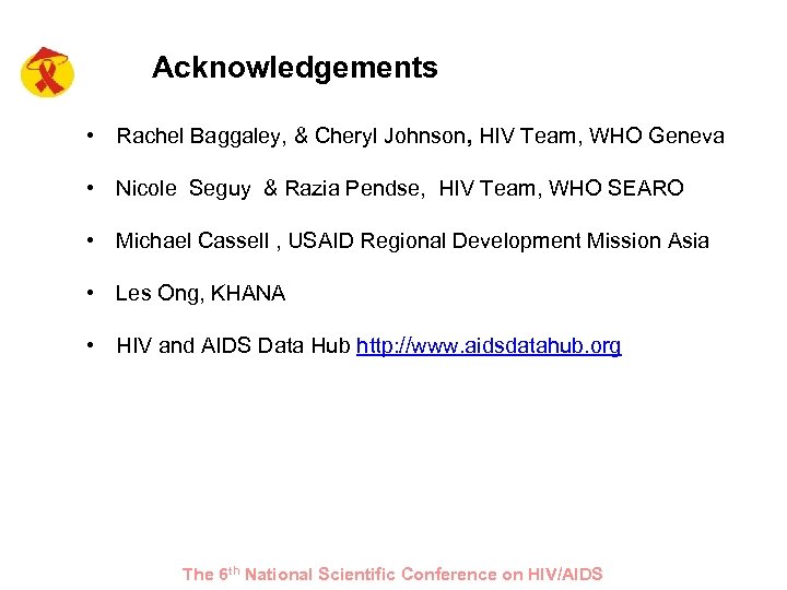 Acknowledgements • Rachel Baggaley, & Cheryl Johnson, HIV Team, WHO Geneva • Nicole Seguy & Razia Pendse, HIV Team, WHO SEARO • Michael Cassell , USAID Regional Development Mission Asia • Les Ong, KHANA • HIV and AIDS Data Hub http: //www. aidsdatahub. org The 6 th National Scientific Conference on HIV/AIDS