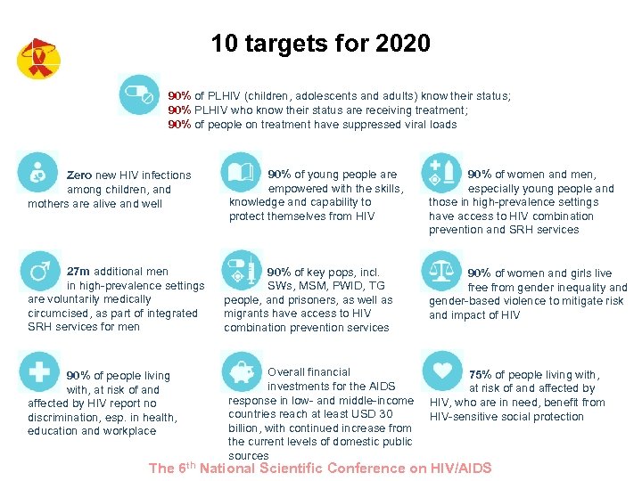 10 targets for 2020 90% of PLHIV (children, adolescents and adults) know their status; 90% PLHIV who know their status are receiving treatment; 90% of people on treatment have suppressed viral loads Zero new HIV infections among children, and mothers are alive and well 27 m additional men in high-prevalence settings are voluntarily medically circumcised, as part of integrated SRH services for men 90% of people living with, at risk of and affected by HIV report no discrimination, esp. in health, education and workplace 90% of young people are empowered with the skills, knowledge and capability to protect themselves from HIV 90% of key pops, incl. SWs, MSM, PWID, TG people, and prisoners, as well as migrants have access to HIV combination prevention services Overall financial investments for the AIDS response in low- and middle-income countries reach at least USD 30 billion, with continued increase from the current levels of domestic public sources 90% of women and men, especially young people and those in high-prevalence settings have access to HIV combination prevention and SRH services 90% of women and girls live free from gender inequality and gender-based violence to mitigate risk and impact of HIV 75% of people living with, at risk of and affected by HIV, who are in need, benefit from HIV-sensitive social protection The 6 th National Scientific Conference on HIV/AIDS