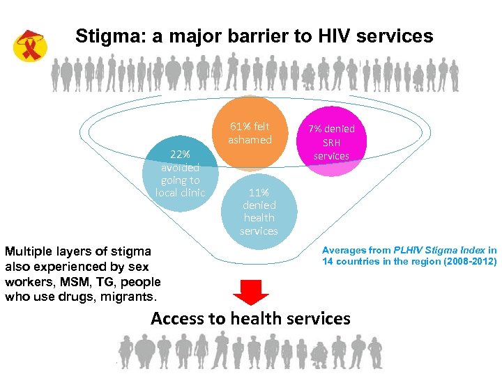 Stigma: a major barrier to HIV services 61% felt ashamed 22% avoided going to local clinic Multiple layers of stigma also experienced by sex workers, MSM, TG, people who use drugs, migrants. 7% denied SRH services 11% denied health services Averages from PLHIV Stigma Index in 14 countries in the region (2008 -2012) Access to health services The 6 th National Scientific Conference on HIV/AIDS