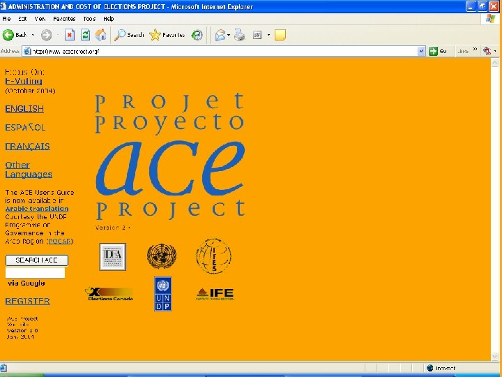 Français | Español | Portuguese | Arabic | Bahasa | Other Administration and Cost of Elections Project search via ACE Electronic Publication Electoral Systems Legislative Framework Electoral Management Boundary Delimitation Voter Education Voter Registration Voting Operations Parties and Candidates THE ACE GLOBAL NETWORK: Welcome to Version 2. 0 of the Administration and Cost of Elections (ACE) Project. This publication contains comprehensive information on various aspects of organizing elections and is divided into twelve major topic areas. To access information on a selected topic, follow the links to the left of your screen or use the search function to locate specific subject matter. The ACE “FOCUS ON” Series Get comprehensive analysis, information and links on particular topics relating election systems, management and administration. The partners of the ACE Project share a commitment to further expanding and enhancing ACE as a high quality knowledge depository of electoral practice, with the aim of building a global partnership to promote knowledge sharing and capacity development. In this spirit, we would like this evolutionary process to involve you, the user. As the ACE Project expands and improves over time, we invite you to share your knowledge, experience and insights with us. Electoral Resources Online A comprehensive database containing election-related materials, samples and resources from all over the word. Democracy Direct An essential stop at IFES for anyone interested in the conduct of elections and the study of contemporary democratic development. Vote Counting Media and Elections Election Integrity Elections and Technology Ask the Experts – The ACE Practitioners’ Network Submit your questions to the ACE Practitioners’ Network and get professional electoral advice online. About the ACE Project Partner Organizations ACE Registration The Electoral Forum Participate to online discussions on topics relating to electoral systems, structures, administration, legislation and principles. Global Election Watch subscribe ACE Website Version 2. 0 unsubscribe Copyright 1998 -2007 email: The EPIC Project EPIC provides comparative and country-by country data on election systems, laws, management and administration. The ACE Electoral Quiz Test and expand your knowledge of the 12 topic areas of the ACE Project, examine issues deeper and improve your skills.