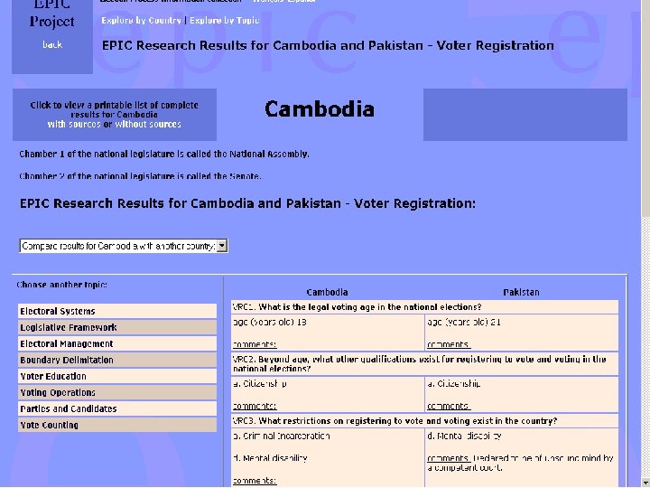 Election Process Information Collection epic project Home The Project The Partners Comparative and country-by-country data on election systems, laws, management and administration Explore by Country Explore by Topic Choose a topic: The Survey Electoral Systems ACE Project Legislative Framework Electoral Management Feedback Boundary Delimitation Voter Education Français Español Voter Registration Choose a Country Albania Voting Operations Parties and Candidates Vote Counting Armenia Australia Austria Bahamas The EPIC Project is a joint endeavour of Barbados Belgium Bosnia Herzegovina Botswana Cambodia