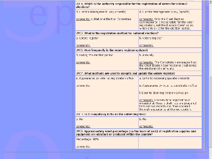KNOWLEDGE SERVICES The Electoral Process Information Collection (EPIC) • KNOWLEDGE BASE: Overall enhancement and upgrade of the core knowledge depository of the ACE Project EPIC offers a systematic collection of how countries actually manage their elections. By presenting information about electoral systems, electoral management, legislative framework, voter registration, voter education and other related topics in a wide range of countries, users are able to compare, and identify common practice within electoral administration. • EXISTING COMPONENTS: Integration and expansion of existing components of the current ACE Project • EXTERNAL RESOURCES: Integration of the ACE Project with already existing and closely related external resources www. epicproject. org