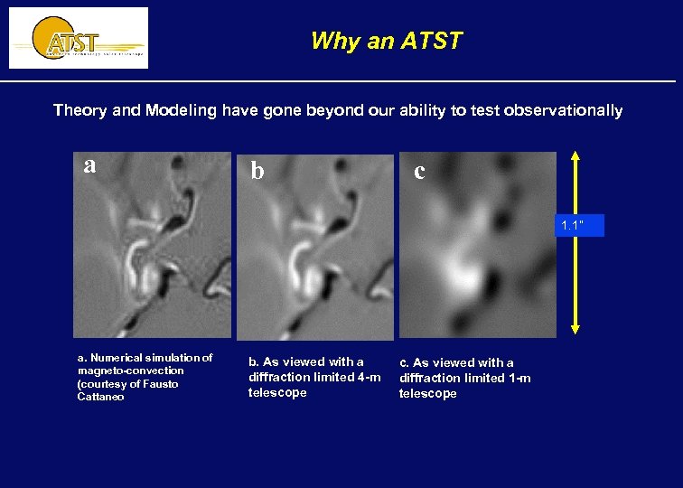 Why an ATST Theory and Modeling have gone beyond our ability to test observationally a (Part V b c 1. 1” a. Numerical simulation of magneto-convection (courtesy of Fausto Cattaneo b. As viewed with a diffraction limited 4 -m telescope c. As viewed with a diffraction limited 1 -m telescope