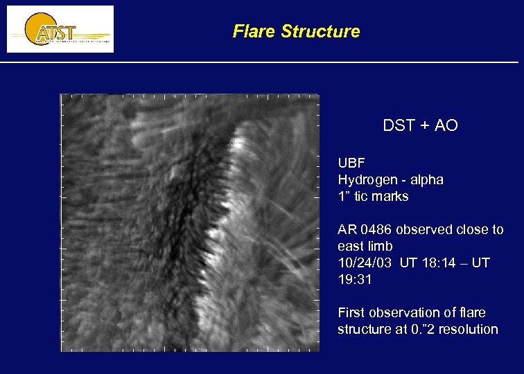 Flare Structure DST + AO UBF Hydrogen - alpha 1” tic marks AR 0486 observed close to east limb 10/24/03 UT 18: 14 – UT 19: 31 First observation of flare structure at 0. ” 2 resolution