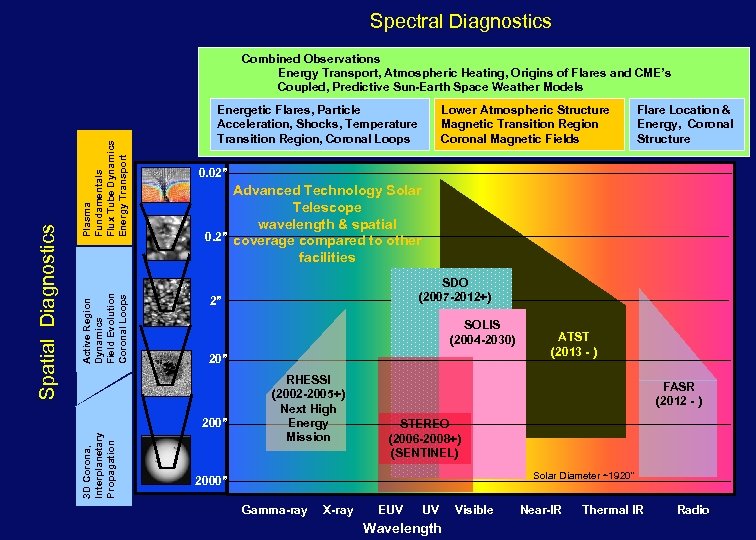 Spectral Diagnostics Plasma Fundamentals Flux Tube Dynamics Energy Transport Active Region Dynamics Field Evolution Coronal Loops Energetic Flares, Particle Acceleration, Shocks, Temperature Transition Region, Coronal Loops Lower Atmospheric Structure Magnetic Transition Region Coronal Magnetic Fields Flare Location & Energy, Coronal Structure 0. 02” Advanced Technology Solar Telescope wavelength & spatial 0. 2” coverage compared to other facilities SDO (2007 -2012+) 2” SOLIS (2004 -2030) 20” 200” 3 D Corona, Interplanetary Propagation Spatial Diagnostics Combined Observations Energy Transport, Atmospheric Heating, Origins of Flares and CME’s Coupled, Predictive Sun-Earth Space Weather Models RHESSI (2002 -2005+) Next High Energy Mission ATST (2013 - ) FASR (2012 - ) STEREO (2006 -2008+) (SENTINEL) Solar Diameter ~1920” 2000” Gamma-ray X-ray EUV UV Wavelength Visible Near-IR Thermal IR Radio