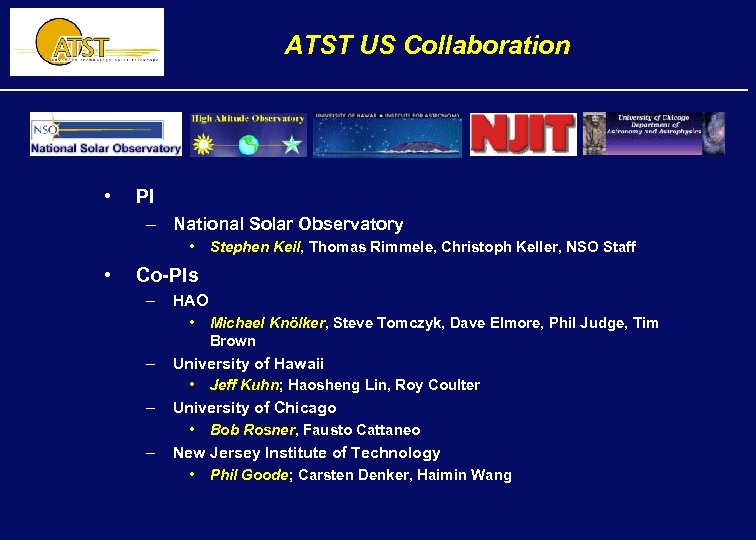 ATST US Collaboration • PI – National Solar Observatory • • Stephen Keil, Thomas Rimmele, Christoph Keller, NSO Staff Co-PIs – HAO • Michael Knölker, Steve Tomczyk, Dave Elmore, Phil Judge, Tim Brown – – – University of Hawaii • Jeff Kuhn; Haosheng Lin, Roy Coulter University of Chicago • Bob Rosner, Fausto Cattaneo New Jersey Institute of Technology • Phil Goode; Carsten Denker, Haimin Wang