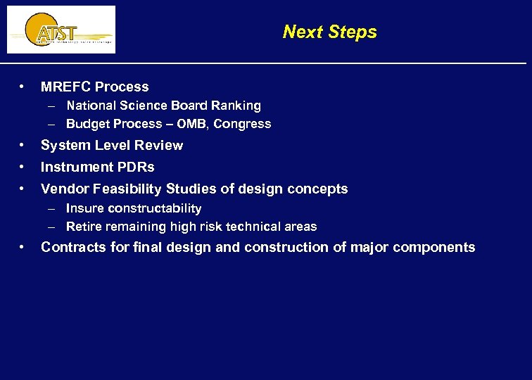 Next Steps • MREFC Process – National Science Board Ranking – Budget Process – OMB, Congress • System Level Review • Instrument PDRs • Vendor Feasibility Studies of design concepts – Insure constructability – Retire remaining high risk technical areas • Contracts for final design and construction of major components