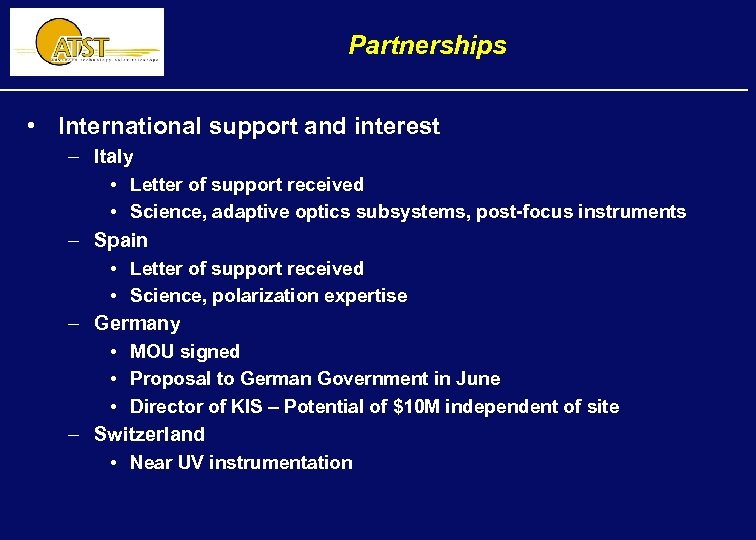 Partnerships • International support and interest – Italy • Letter of support received • Science, adaptive optics subsystems, post-focus instruments – Spain • Letter of support received • Science, polarization expertise – Germany • MOU signed • Proposal to German Government in June • Director of KIS – Potential of $10 M independent of site – Switzerland • Near UV instrumentation