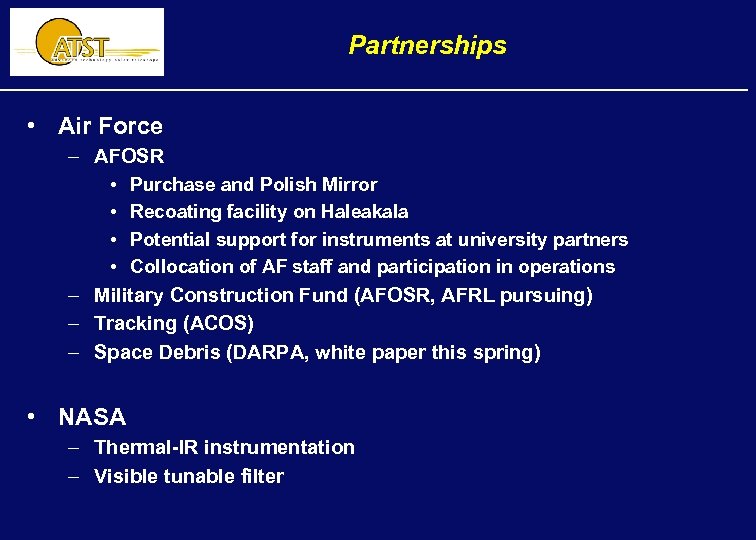 Partnerships • Air Force – AFOSR • Purchase and Polish Mirror • Recoating facility on Haleakala • Potential support for instruments at university partners • Collocation of AF staff and participation in operations – Military Construction Fund (AFOSR, AFRL pursuing) – Tracking (ACOS) – Space Debris (DARPA, white paper this spring) • NASA – Thermal-IR instrumentation – Visible tunable filter