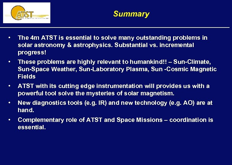 Summary • The 4 m ATST is essential to solve many outstanding problems in solar astronomy & astrophysics. Substantial vs. incremental progress! • These problems are highly relevant to humankind!! – Sun-Climate, Sun-Space Weather, Sun-Laboratory Plasma, Sun -Cosmic Magnetic Fields • ATST with its cutting edge instrumentation will provides us with a powerful tool solve the mysteries of solar magnetism. • New diagnostics tools (e. g. IR) and new technology (e. g. AO) are at hand. • Complementary role of ATST and Space Missions – coordination is essential.