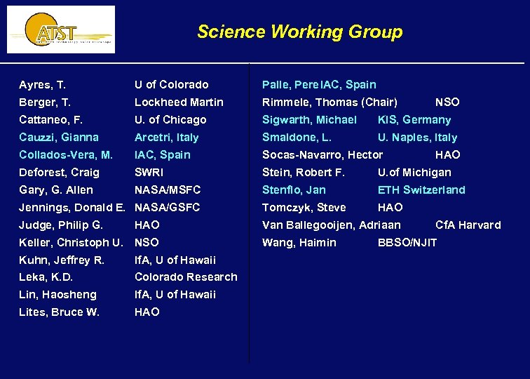 Science Working Group Ayres, T. U of Colorado Palle, Pere. IAC, Spain Berger, T. Lockheed Martin Rimmele, Thomas (Chair) Cattaneo, F. U. of Chicago Sigwarth, Michael KIS, Germany Cauzzi, Gianna Arcetri, Italy Smaldone, L. U. Naples, Italy Collados-Vera, M. IAC, Spain Socas-Navarro, Hector Deforest, Craig SWRI Stein, Robert F. U. of Michigan Gary, G. Allen NASA/MSFC Stenflo, Jan ETH Switzerland Jennings, Donald E. NASA/GSFC Tomczyk, Steve HAO Judge, Philip G. Van Ballegooijen, Adriaan HAO Keller, Christoph U. NSO Kuhn, Jeffrey R. If. A, U of Hawaii Leka, K. D. Colorado Research Lin, Haosheng If. A, U of Hawaii Lites, Bruce W. HAO Wang, Haimin NSO HAO Cf. A Harvard BBSO/NJIT