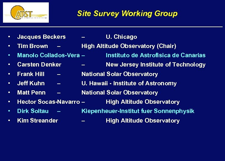 Site Survey Working Group • Jacques Beckers – • Tim Brown High Altitude Observatory (Chair) • Manolo Collados-Vera – Instituto de Astrofisica de Canarias • Carsten Denker – New Jersey Institute of Technology • Frank Hill – National Solar Observatory • Jeff Kuhn – U. Hawaii - Institute of Astronomy • Matt Penn – National Solar Observatory • Hector Socas-Navarro – • Dirk Soltau • Kim Streander – – U. Chicago High Altitude Observatory Kiepenheuer-Institut fuer Sonnenphysik – High Altitude Observatory