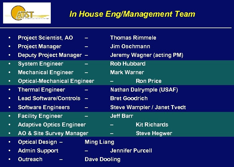 In House Eng/Management Team • Project Scientist, AO – Thomas Rimmele • Project Manager – Jim Oschmann • Deputy Project Manager – Jeremy Wagner (acting PM) • System Engineer – Rob Hubbard • Mechanical Engineer – Mark Warner • Optical-Mechanical Engineer – • Thermal Engineer Nathan Dalrymple (USAF) • Lead Software/Controls – Bret Goodrich • Software Engineers – Steve Wampler / Janet Tvedt • Facility Engineer – Jeff Barr • Adaptive Optics Engineer – Kit Richards • AO & Site Survey Manager – Steve Hegwer • Optical Design – Ming Liang • Admin Support – • Outreach – – Ron Price Jennifer Purcell Dave Dooling
