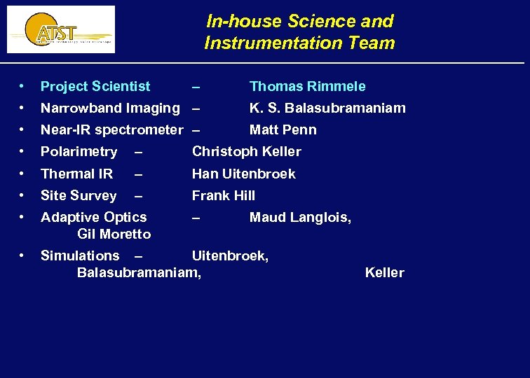 In-house Science and Instrumentation Team • Project Scientist • Narrowband Imaging – K. S. Balasubramaniam • Near-IR spectrometer – Matt Penn • Polarimetry – Christoph Keller • Thermal IR – Han Uitenbroek • Site Survey – Frank Hill • Adaptive Optics Gil Moretto • Simulations – Uitenbroek, Balasubramaniam, – – Thomas Rimmele Maud Langlois, Keller
