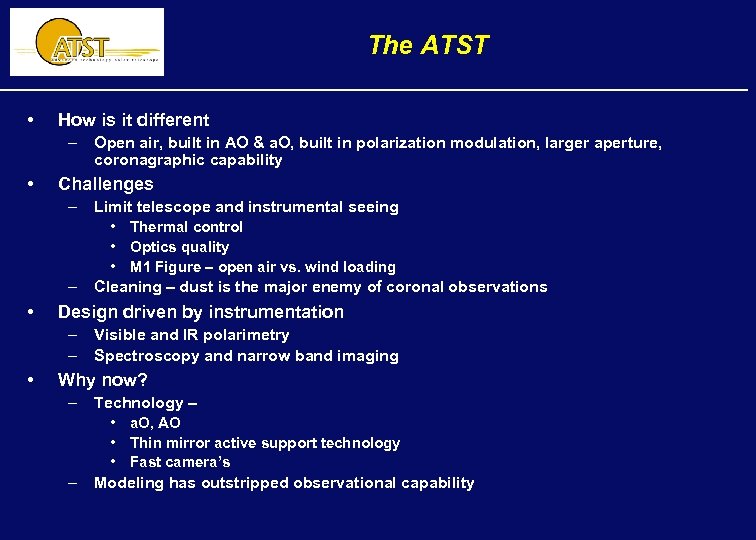 The ATST • How is it different – • Challenges – – • Limit telescope and instrumental seeing • Thermal control • Optics quality • M 1 Figure – open air vs. wind loading Cleaning – dust is the major enemy of coronal observations Design driven by instrumentation – – • Open air, built in AO & a. O, built in polarization modulation, larger aperture, coronagraphic capability Visible and IR polarimetry Spectroscopy and narrow band imaging Why now? – – Technology – • a. O, AO • Thin mirror active support technology • Fast camera’s Modeling has outstripped observational capability