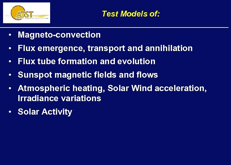 : Test Models of: • Magneto-convection • Flux emergence, transport and annihilation • Flux tube formation and evolution • Sunspot magnetic fields and flows • Atmospheric heating, Solar Wind acceleration, Irradiance variations • Solar Activity