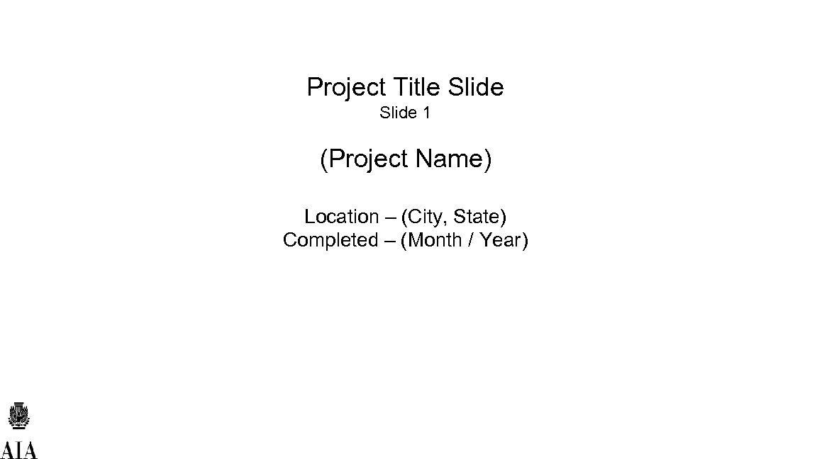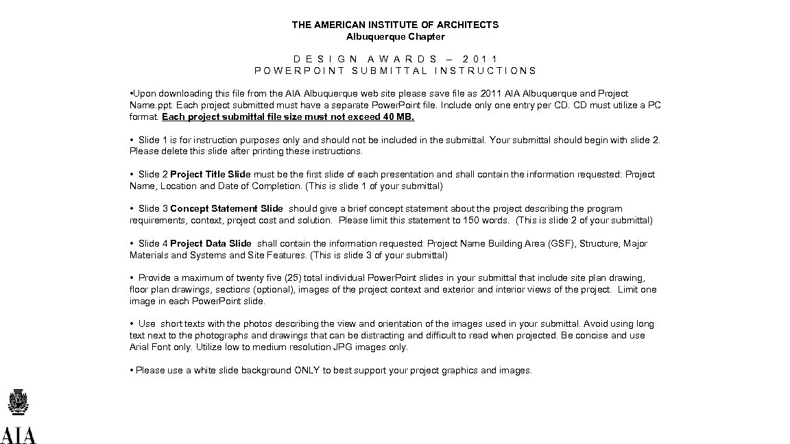 THE AMERICAN INSTITUTE OF ARCHITECTS Albuquerque Chapter D E S I G N A W A R D S – 2 01 1 POWERPOINT SUBMITTAL INSTRUCTIONS • Upon downloading this file from the AIA Albuquerque web site please save file as 2011 AIA Albuquerque and Project Name. ppt. Each project submitted must have a separate Power. Point file. Include only one entry per CD. CD must utilize a PC format. Each project submittal file size must not exceed 40 MB. • Slide 1 is for instruction purposes only and should not be included in the submittal. Your submittal should begin with slide 2. Please delete this slide after printing these instructions. • Slide 2 Project Title Slide must be the first slide of each presentation and shall contain the information requested: Project Name, Location and Date of Completion. (This is slide 1 of your submittal) • Slide 3 Concept Statement Slide should give a brief concept statement about the project describing the program requirements, context, project cost and solution. Please limit this statement to 150 words. (This is slide 2 of your submittal) • Slide 4 Project Data Slide shall contain the information requested: Project Name Building Area (GSF), Structure, Major Materials and Systems and Site Features. (This is slide 3 of your submittal) • Provide a maximum of twenty five (25) total individual Power. Point slides in your submittal that include site plan drawing, floor plan drawings, sections (optional), images of the project context and exterior and interior views of the project. Limit one image in each Power. Point slide. • Use short texts with the photos describing the view and orientation of the images used in your submittal. Avoid using long text next to the photographs and drawings that can be distracting and difficult to read when projected. Be concise and use Arial Font only. Utilize low to medium resolution JPG images only. • Please use a white slide background ONLY to best support your project graphics and images.