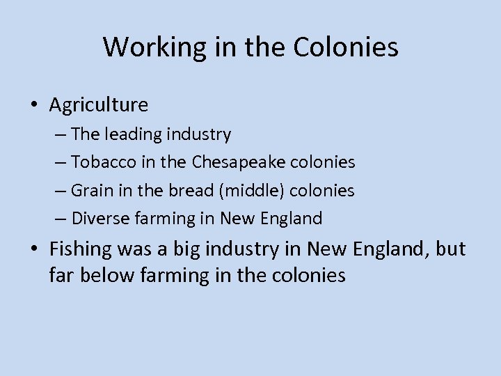 Working in the Colonies • Agriculture – The leading industry – Tobacco in the Chesapeake colonies – Grain in the bread (middle) colonies – Diverse farming in New England • Fishing was a big industry in New England, but far below farming in the colonies