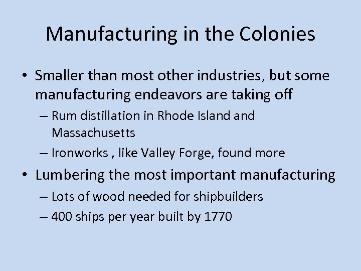 Manufacturing in the Colonies • Smaller than most other industries, but some manufacturing endeavors are taking off – Rum distillation in Rhode Island Massachusetts – Ironworks , like Valley Forge, found more • Lumbering the most important manufacturing – Lots of wood needed for shipbuilders – 400 ships per year built by 1770