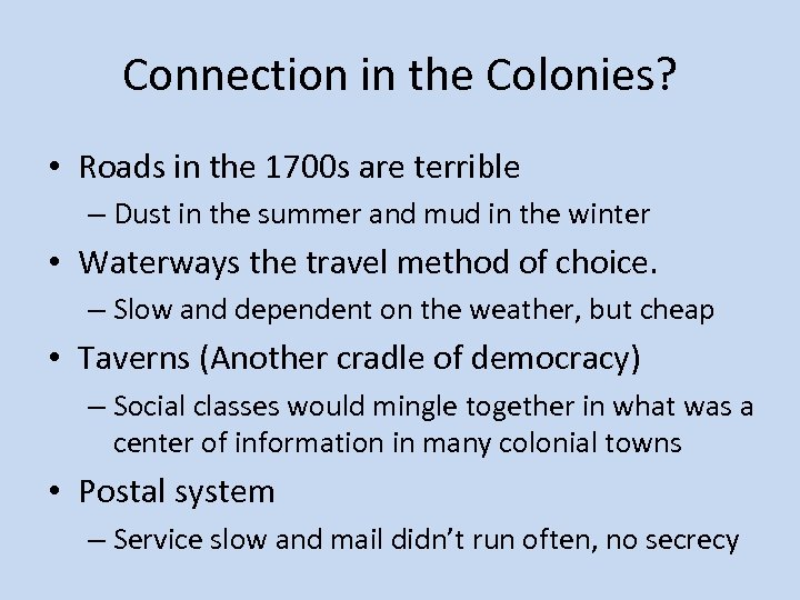 Connection in the Colonies? • Roads in the 1700 s are terrible – Dust in the summer and mud in the winter • Waterways the travel method of choice. – Slow and dependent on the weather, but cheap • Taverns (Another cradle of democracy) – Social classes would mingle together in what was a center of information in many colonial towns • Postal system – Service slow and mail didn’t run often, no secrecy