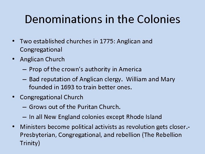 Denominations in the Colonies • Two established churches in 1775: Anglican and Congregational • Anglican Church – Prop of the crown’s authority in America – Bad reputation of Anglican clergy. William and Mary founded in 1693 to train better ones. • Congregational Church – Grows out of the Puritan Church. – In all New England colonies except Rhode Island • Ministers become political activists as revolution gets closer. Presbyterian, Congregational, and rebellion (The Rebellion Trinity)