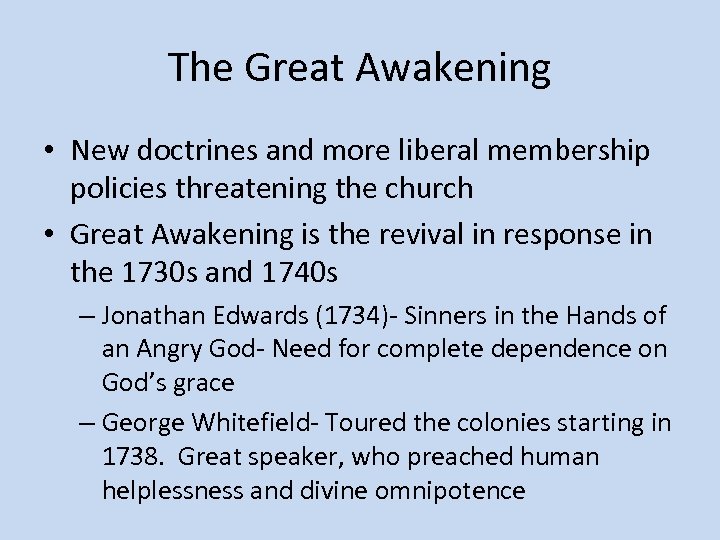The Great Awakening • New doctrines and more liberal membership policies threatening the church • Great Awakening is the revival in response in the 1730 s and 1740 s – Jonathan Edwards (1734)- Sinners in the Hands of an Angry God- Need for complete dependence on God’s grace – George Whitefield- Toured the colonies starting in 1738. Great speaker, who preached human helplessness and divine omnipotence