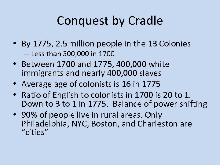 Conquest by Cradle • By 1775, 2. 5 million people in the 13 Colonies – Less than 300, 000 in 1700 • Between 1700 and 1775, 400, 000 white immigrants and nearly 400, 000 slaves • Average of colonists is 16 in 1775 • Ratio of English to colonists in 1700 is 20 to 1. Down to 3 to 1 in 1775. Balance of power shifting • 90% of people live in rural areas. Only Philadelphia, NYC, Boston, and Charleston are “cities”