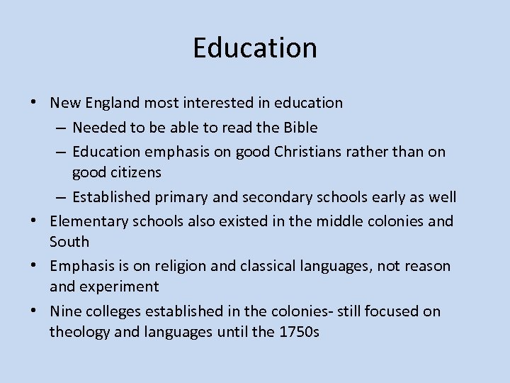 Education • New England most interested in education – Needed to be able to read the Bible – Education emphasis on good Christians rather than on good citizens – Established primary and secondary schools early as well • Elementary schools also existed in the middle colonies and South • Emphasis is on religion and classical languages, not reason and experiment • Nine colleges established in the colonies- still focused on theology and languages until the 1750 s