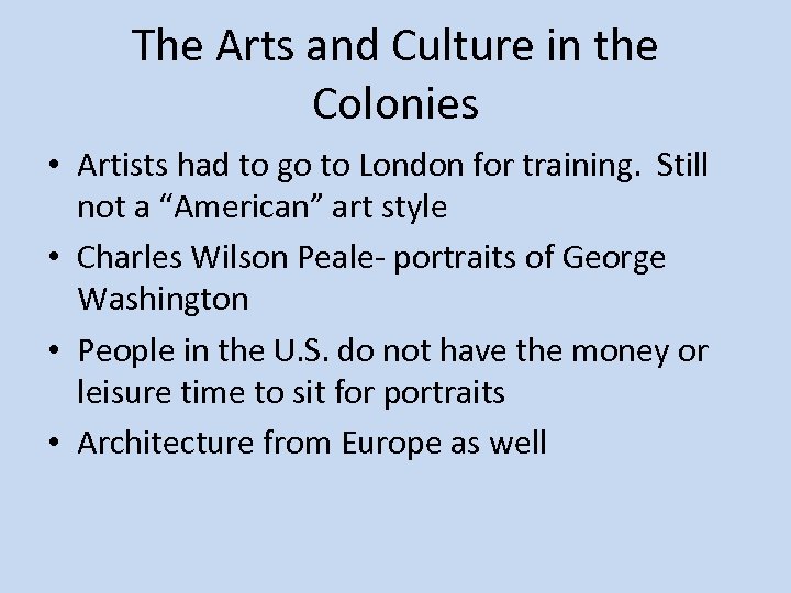 The Arts and Culture in the Colonies • Artists had to go to London for training. Still not a “American” art style • Charles Wilson Peale- portraits of George Washington • People in the U. S. do not have the money or leisure time to sit for portraits • Architecture from Europe as well