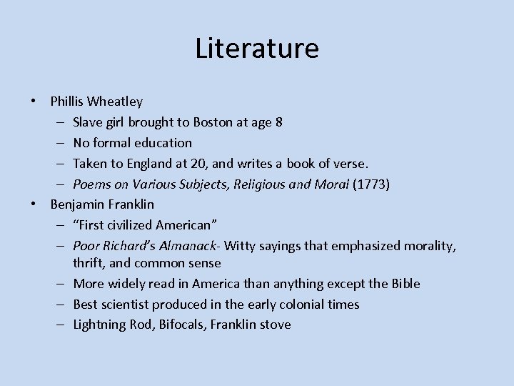 Literature • Phillis Wheatley – Slave girl brought to Boston at age 8 – No formal education – Taken to England at 20, and writes a book of verse. – Poems on Various Subjects, Religious and Moral (1773) • Benjamin Franklin – “First civilized American” – Poor Richard’s Almanack- Witty sayings that emphasized morality, thrift, and common sense – More widely read in America than anything except the Bible – Best scientist produced in the early colonial times – Lightning Rod, Bifocals, Franklin stove