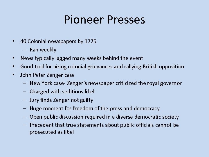 Pioneer Presses • 40 Colonial newspapers by 1775 – Ran weekly • News typically lagged many weeks behind the event • Good tool for airing colonial grievances and rallying British opposition • John Peter Zenger case – New York case- Zenger’s newspaper criticized the royal governor – Charged with seditious libel – Jury finds Zenger not guilty – Huge moment for freedom of the press and democracy – Open public discussion required in a diverse democratic society – Precedent that true statements about public officials cannot be prosecuted as libel