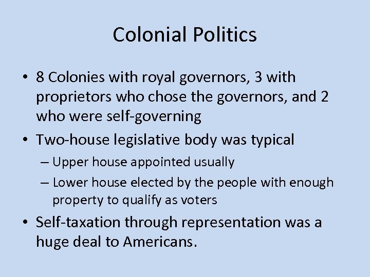 Colonial Politics • 8 Colonies with royal governors, 3 with proprietors who chose the governors, and 2 who were self-governing • Two-house legislative body was typical – Upper house appointed usually – Lower house elected by the people with enough property to qualify as voters • Self-taxation through representation was a huge deal to Americans.