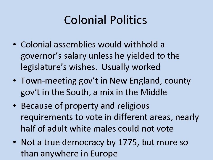 Colonial Politics • Colonial assemblies would withhold a governor’s salary unless he yielded to the legislature’s wishes. Usually worked • Town-meeting gov’t in New England, county gov’t in the South, a mix in the Middle • Because of property and religious requirements to vote in different areas, nearly half of adult white males could not vote • Not a true democracy by 1775, but more so than anywhere in Europe