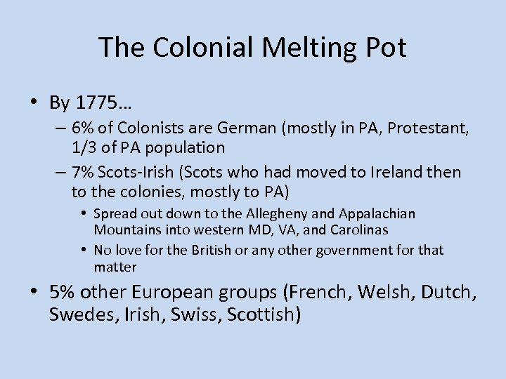 The Colonial Melting Pot • By 1775… – 6% of Colonists are German (mostly in PA, Protestant, 1/3 of PA population – 7% Scots-Irish (Scots who had moved to Ireland then to the colonies, mostly to PA) • Spread out down to the Allegheny and Appalachian Mountains into western MD, VA, and Carolinas • No love for the British or any other government for that matter • 5% other European groups (French, Welsh, Dutch, Swedes, Irish, Swiss, Scottish)