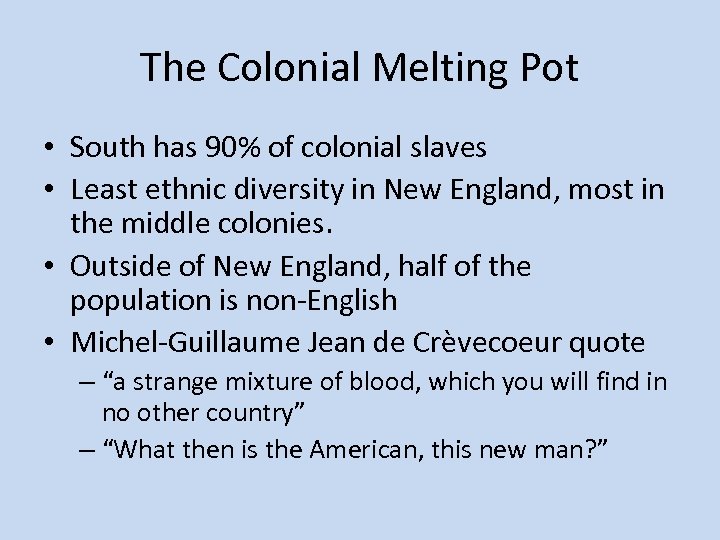 The Colonial Melting Pot • South has 90% of colonial slaves • Least ethnic diversity in New England, most in the middle colonies. • Outside of New England, half of the population is non-English • Michel-Guillaume Jean de Crèvecoeur quote – “a strange mixture of blood, which you will find in no other country” – “What then is the American, this new man? ”