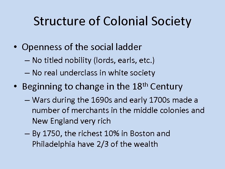 Structure of Colonial Society • Openness of the social ladder – No titled nobility (lords, earls, etc. ) – No real underclass in white society • Beginning to change in the 18 th Century – Wars during the 1690 s and early 1700 s made a number of merchants in the middle colonies and New England very rich – By 1750, the richest 10% in Boston and Philadelphia have 2/3 of the wealth