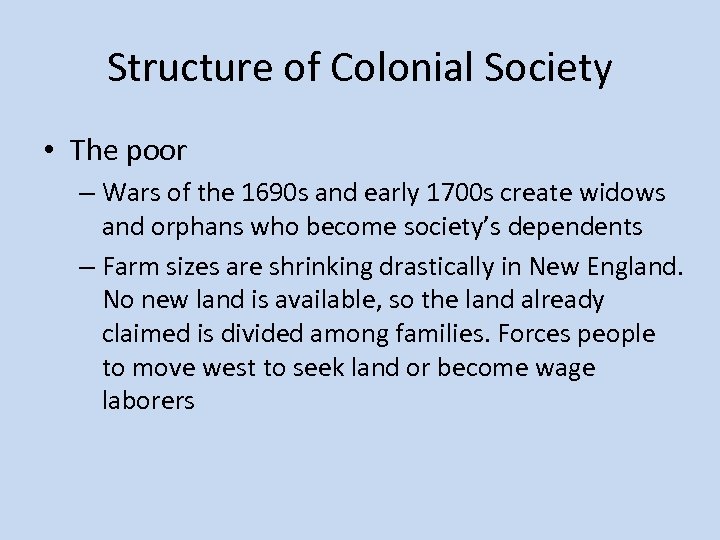 Structure of Colonial Society • The poor – Wars of the 1690 s and early 1700 s create widows and orphans who become society’s dependents – Farm sizes are shrinking drastically in New England. No new land is available, so the land already claimed is divided among families. Forces people to move west to seek land or become wage laborers