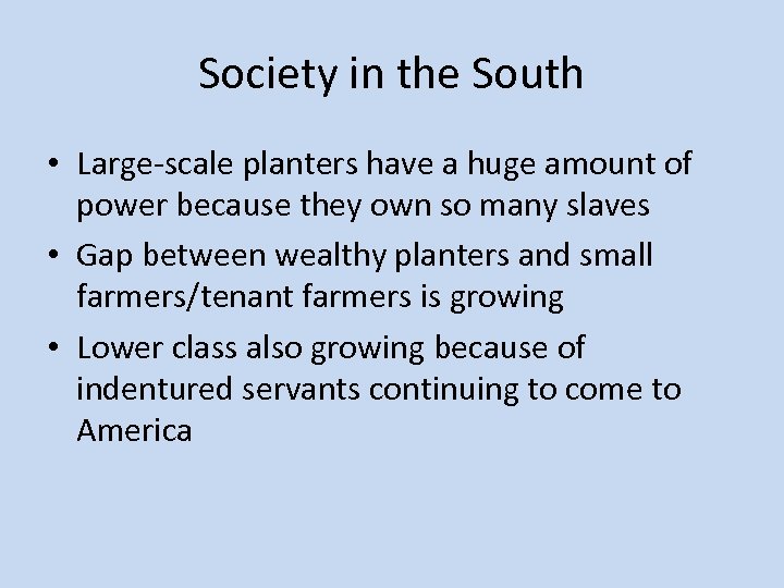 Society in the South • Large-scale planters have a huge amount of power because they own so many slaves • Gap between wealthy planters and small farmers/tenant farmers is growing • Lower class also growing because of indentured servants continuing to come to America