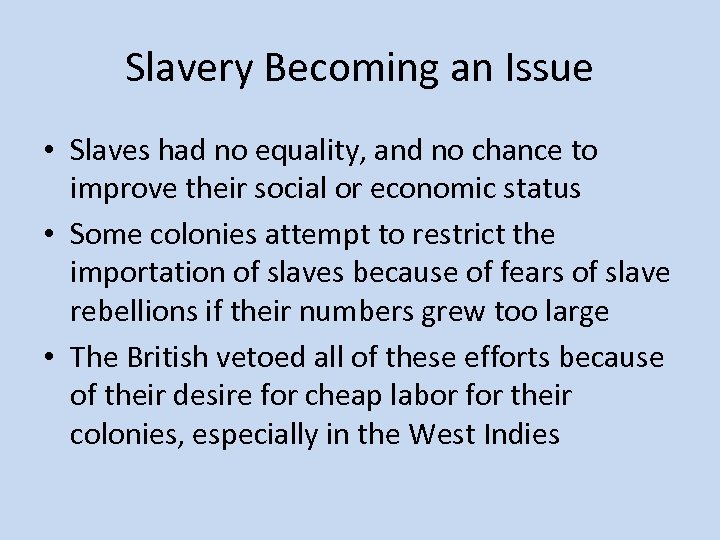 Slavery Becoming an Issue • Slaves had no equality, and no chance to improve their social or economic status • Some colonies attempt to restrict the importation of slaves because of fears of slave rebellions if their numbers grew too large • The British vetoed all of these efforts because of their desire for cheap labor for their colonies, especially in the West Indies