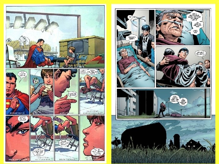 WHAT AM I LOOKING AT EXACTLY? • Comic books involve the use of static imagery and dialogue to tell a story. Unlike in movies, comic books must create the illusion of time and space and movement. In a movie, Batgirl would leap out of the way of the explosion and sucker punch Robin in a single beat, and the viewer would only need to sit back and enjoy the spectacle. • On a comic page, each panel is an individual beat. "Batgirl leaps away from explosion" --> "Batgirl composes herself while Robin looks down at her" --> "Robin claps" --> "Batgirl sucker punches Robin in the gut" --> "Batgirl clocks Robin in the head" --> "Batman looms over Batgirl as Robin tries to get up. " • Comic books ask for some effort by the reader to fill in the blanks between panels. By the way, the white space between panels is commonly referred to as "gutters" in comic book lingo. Table of Contents