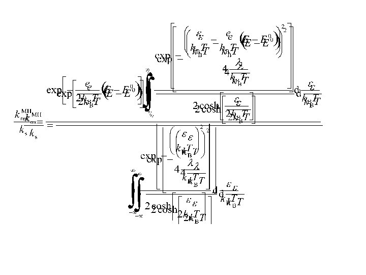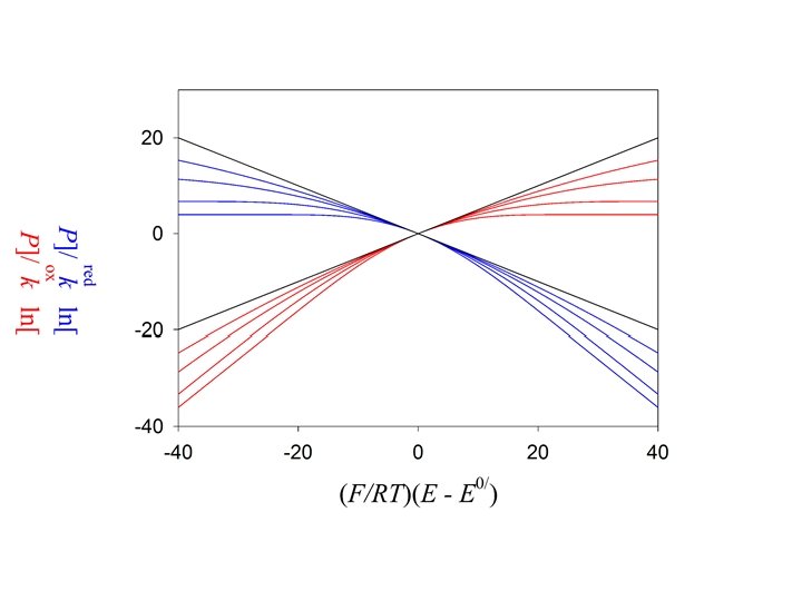Key features of these equations: 1. Nernst condition obtains (obvious from equations), i. e. : 2. Maximum value of kox. MH /P and kred. MH /P is 1. 000 (not obvious) 3. Computation shows that for any given value of : kox. MH /P = 0. 5 when e(E – E 0/) = kred. MH /P = 0. 5 when – e(E – E 0/) =